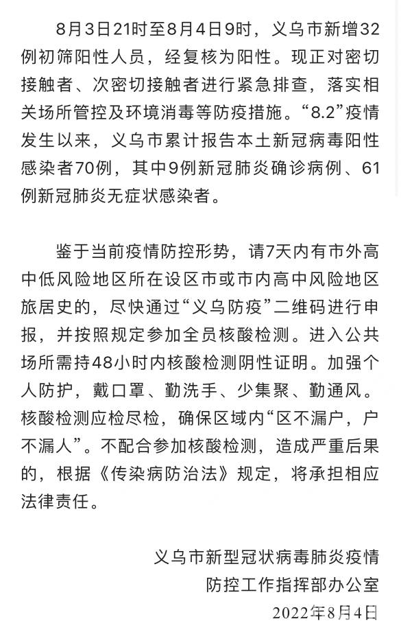 关于义乌市新增32例新冠病毒阳性感染者的通报