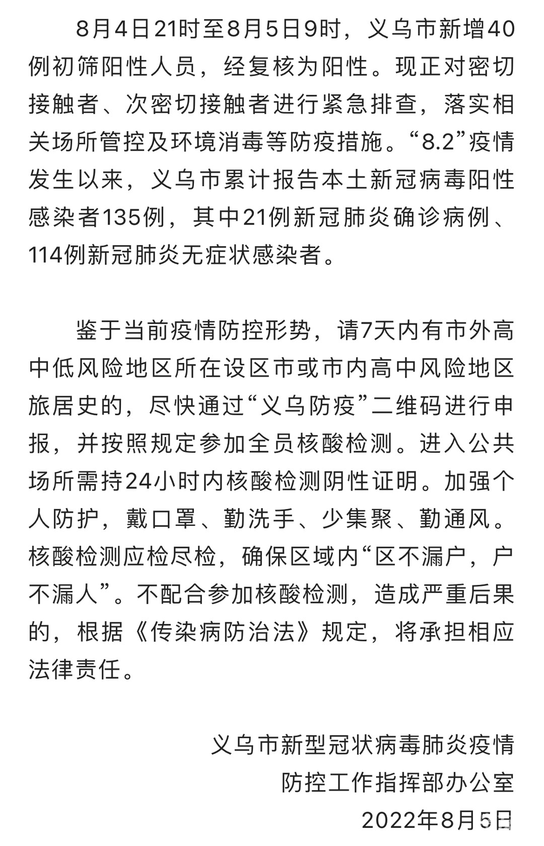 关于义乌市新增40例新冠病毒阳性感染者的通报