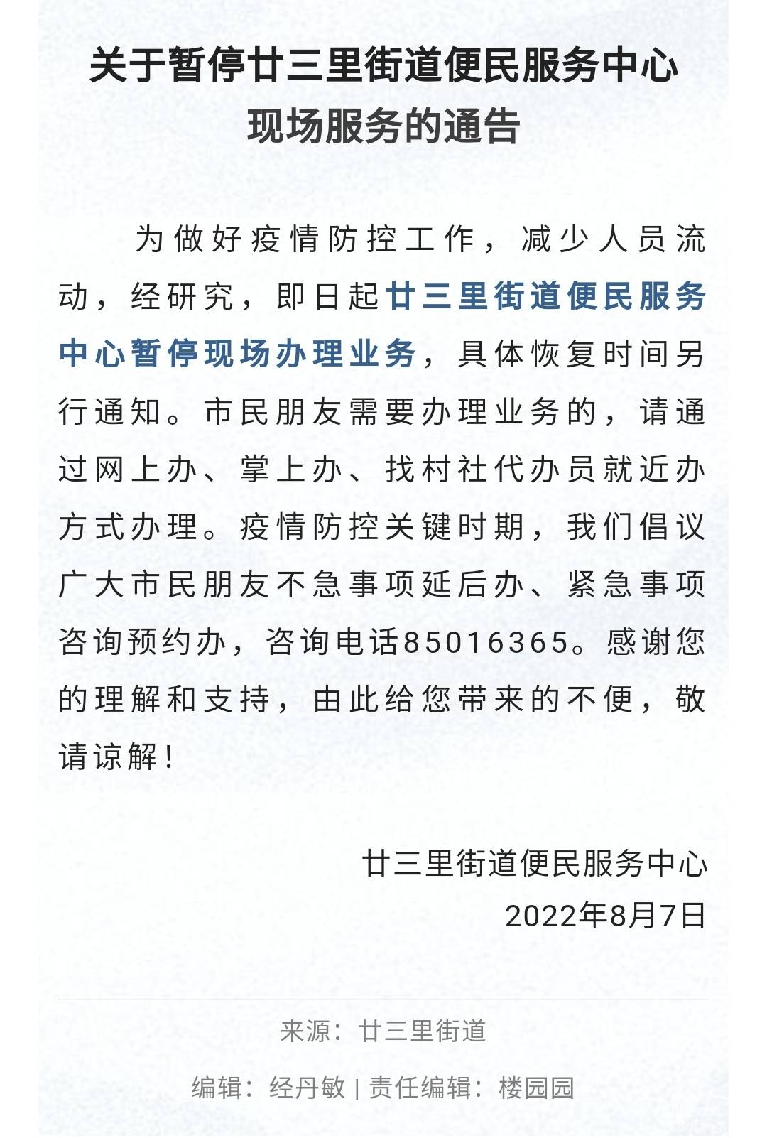 关于暂停廿三里街道便民服务中心现场服务的通告