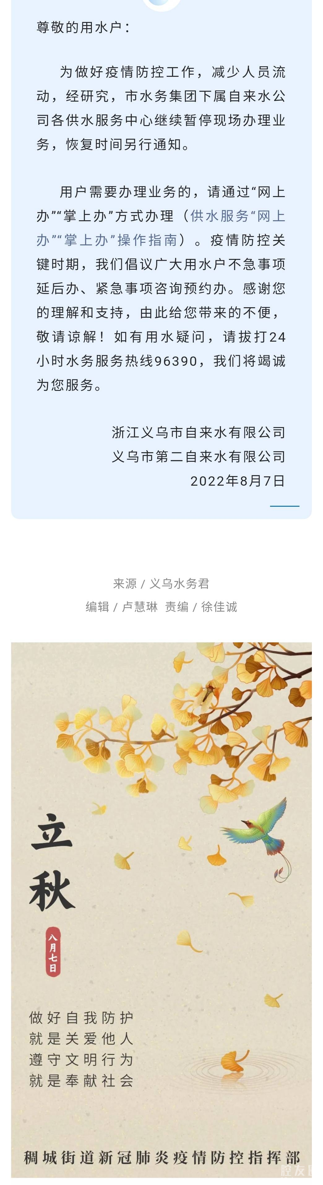 关于继续暂停供水服务中心现场服务的通告