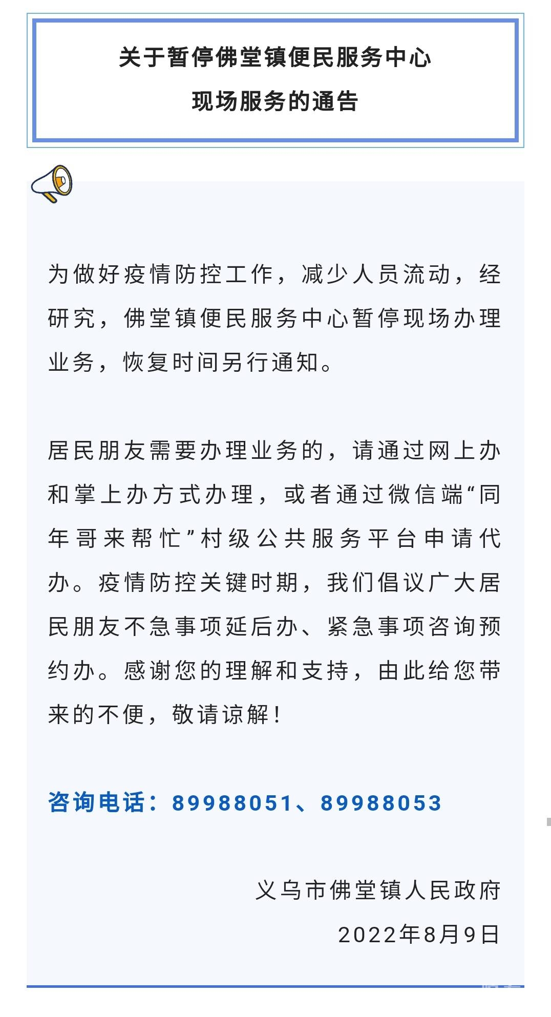 关于暂停佛堂镇便民服务中心现场服务的通告