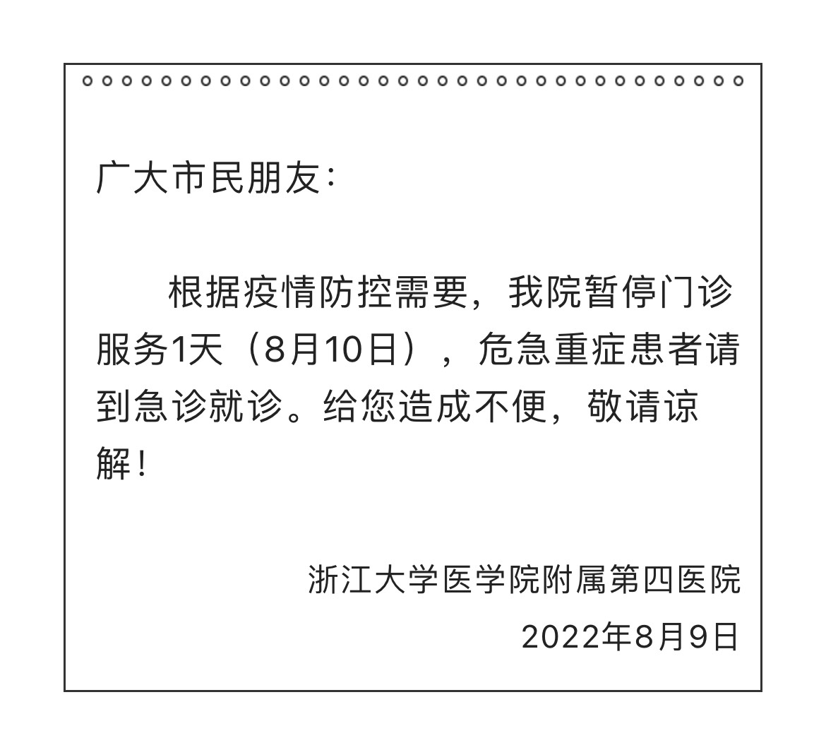 关于浙江大学医学院附属第四医院暂停门诊的通告