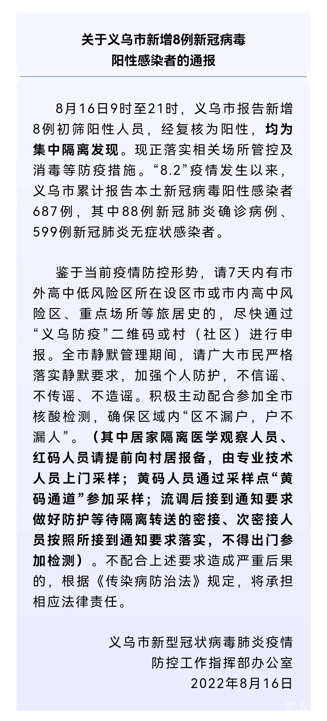 义乌市新增8例新冠病毒阳性感染者,均为集中隔离发现
