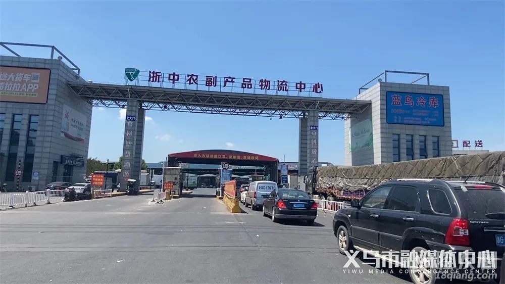 8月18日上午10时,浙中农副产品物流中心北大门,大货车正排着长队,按要求进行防疫检查,符合条件方可入内。