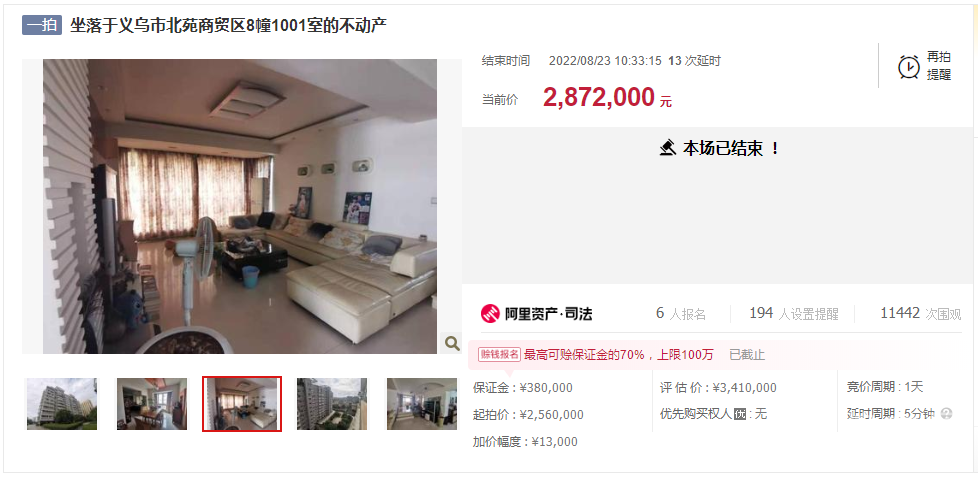 8月23日,在阿里司法拍卖网络平台,经过16次出价,坐落于义乌市北苑商贸区8幢1001室的不动产以287.2万元总价成交。