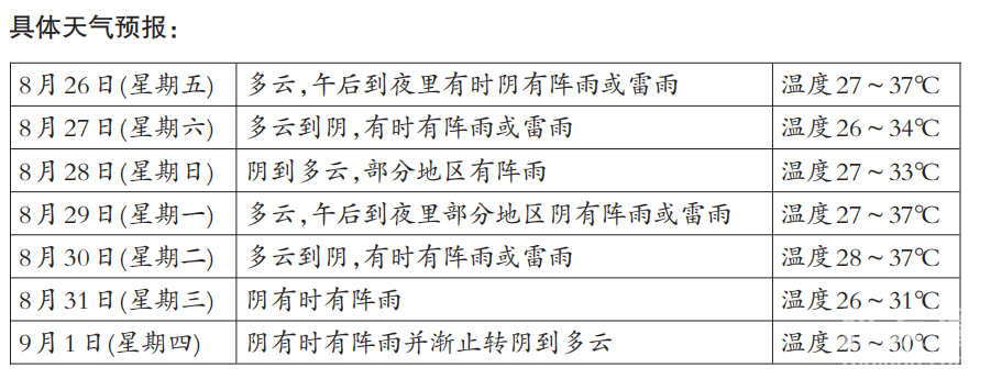 接下去的“秋老虎”有多强势?还会持续多久?市气象台工作人员介绍,虽然还有“秋老虎”,但好在未来几天,我市将受到两波冷空气的影响,阵雨天气增多,不会出现7、8月那种长时间持续的高温天气。接下去,大家更要注意防范强对流天气。由于长期高温,大气中能量积累加大,因此,我市局部地区伴有短时暴雨和雷雨大风等强对流天气。具体来看,今明两天及8月30日,雷阵雨天气较明显。从气温来看,今天最高气温还在37℃左右;周末的最高气温将降至33℃左右;8月29日—30日,副热带高压加强,最高气温又回到35℃以上;8月31日到9月1日,第二波冷空气渗透,湿度大,气温下降,最高气温在30~31℃。