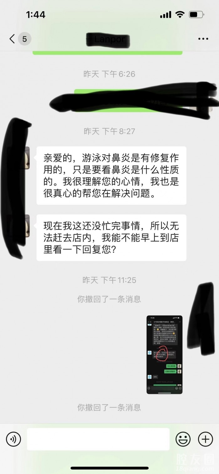 在7月底 我立马停掉了游泳课,给我家大的去治疗。这边也和店长沟通,我要退掉这个课程,店长都答应的好好的,也承认那个推销给我的销售不是很专业 ,没有提到鼻炎问题!才上了2天班就已离职!中间也真的波折,各种推脱,各种催!在这个事情过去整整1个月,退款的人来了说我上了11节课要扣了我4000+,(包含课时费,手续费,包含赠送的泳衣360元)我真的想骂人!