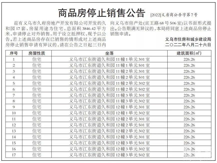 兹有义乌市久府房地产开发有限公司开发的久和园17套,房屋用途为住宅,总面积3846.42平方米,申请停止对外销售,用于设立抵押权,现予以公告。若上述商品房存在已销售的情形或对上述商品房停止销售申请有异议的,请在公告之日起三日内向义乌市房产处(宾王路68号506室)以书面形式提出。公告期满无异议的,本局将同意上述商品房停止销售申请。