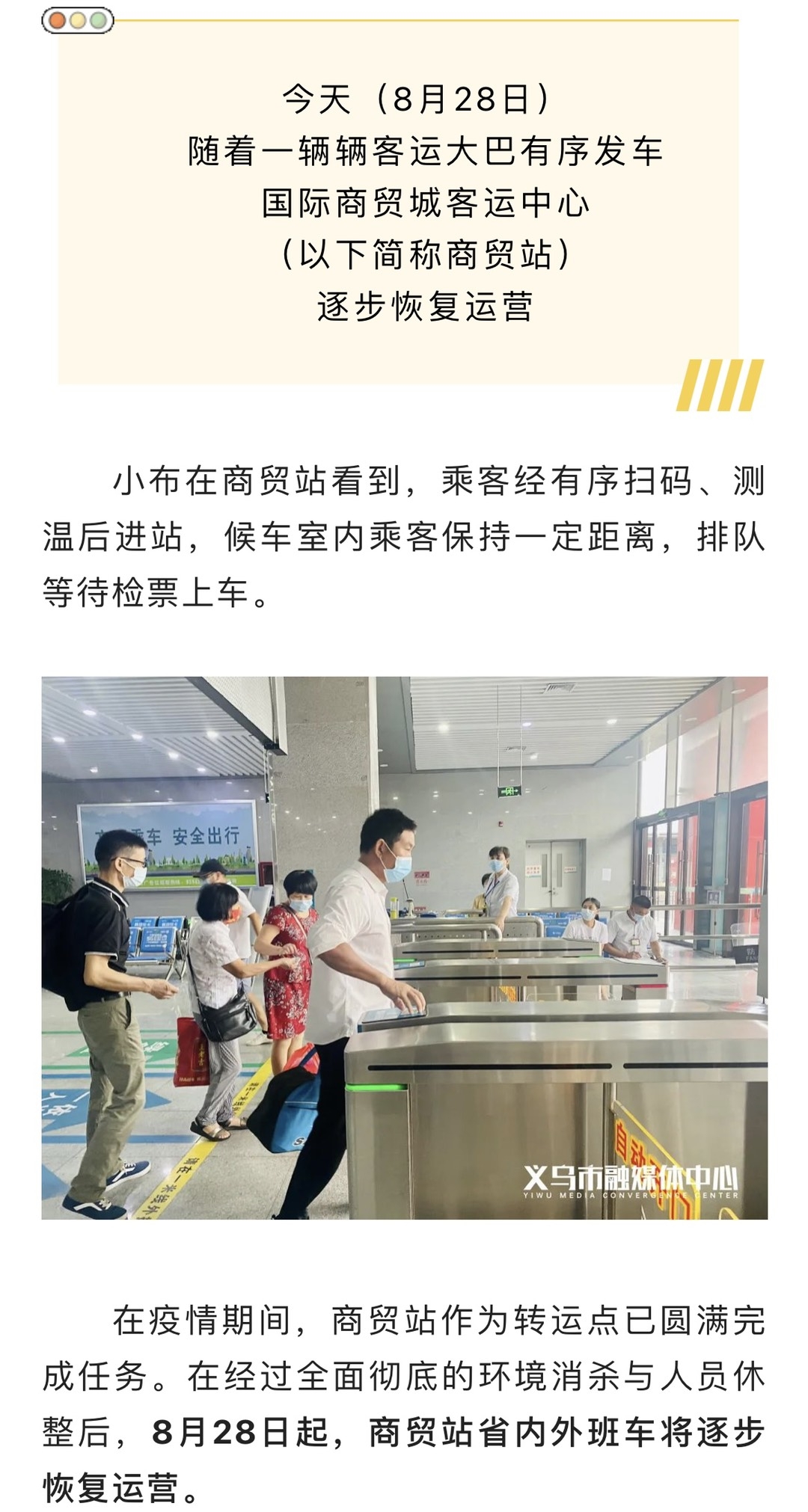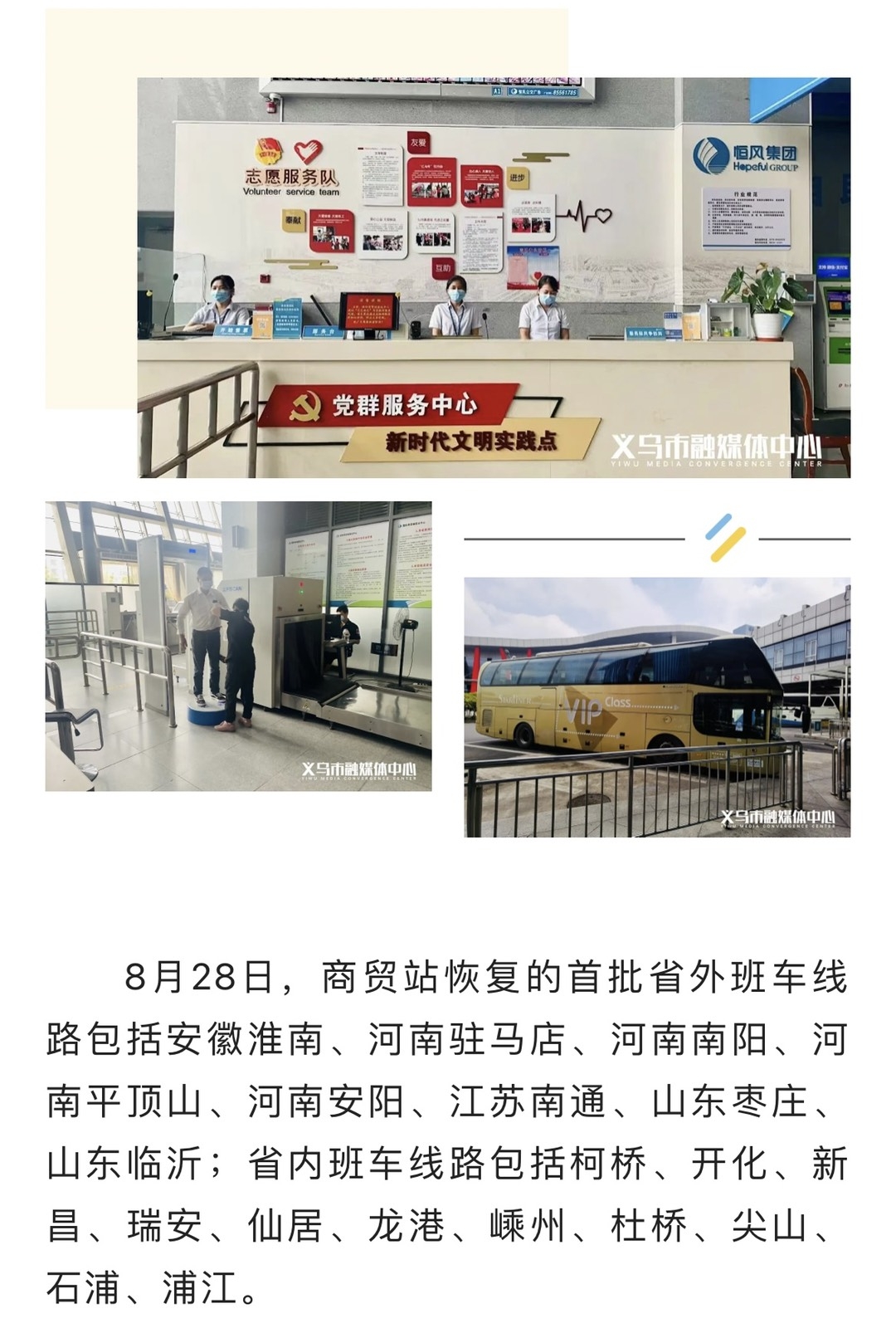后续,商贸站将陆续恢复永康、武义、萧山、萧山机场等地班线,具体恢复线路情况可拨打96233咨询。