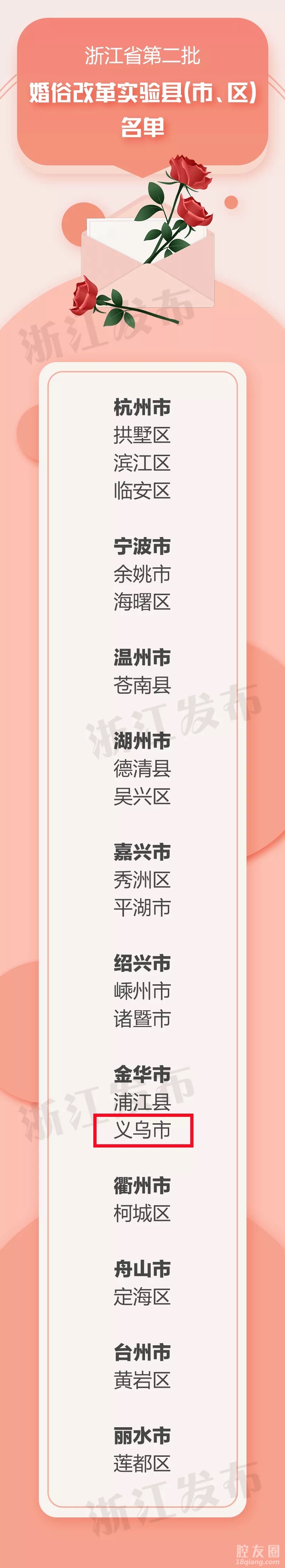 2020年6月,省民政厅出台《全省婚俗改革试点工作方案》,并于2020年8月确定19个全省首批婚俗改革实验县(市、区)。近期,在各地申报推荐的基础上,省民政厅又确定杭州市拱墅区等18个县(市、区)为全省第二批婚俗改革实验县(市、区),其中义乌也位列其中。试点时间原则上为两年。