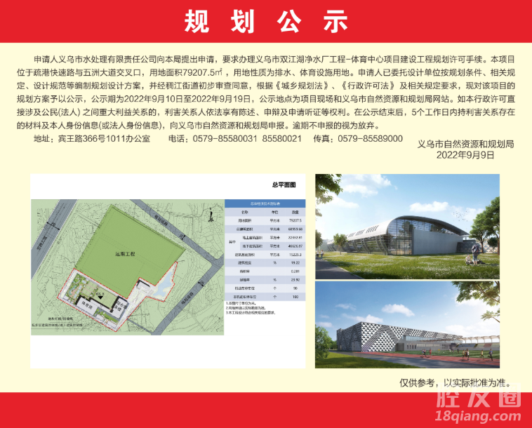 9月9日,义乌市双江湖净水厂工程体育中心项目规划方案出炉。 项目位于疏港快速路与五洲大道交叉口,用地面积79207.5㎡,约118.8亩,用地性质为排水、体育设施用地。根据规划方案,项目包含体育馆、综合服务楼等工程,总建筑面积约6.9万㎡,其中地上建筑面积约2.2万㎡,建筑密度19.22%,容积率0.28,设计机动车位90个。