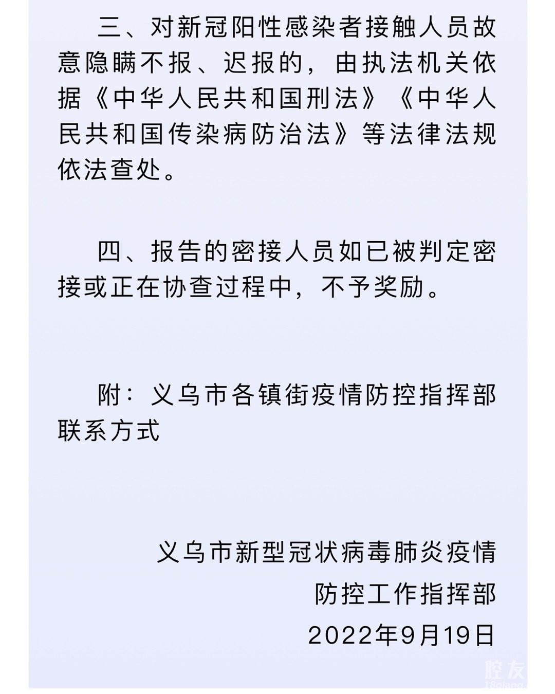 [义乌故事]关于新冠肺炎阳性感染者接触人员主动报告有关事项的通告 [复制链接]