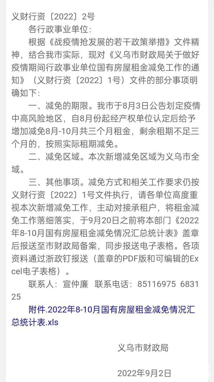 义乌市财政局关于做好疫情期间行政事业单位国有房屋租金减免工作的通知