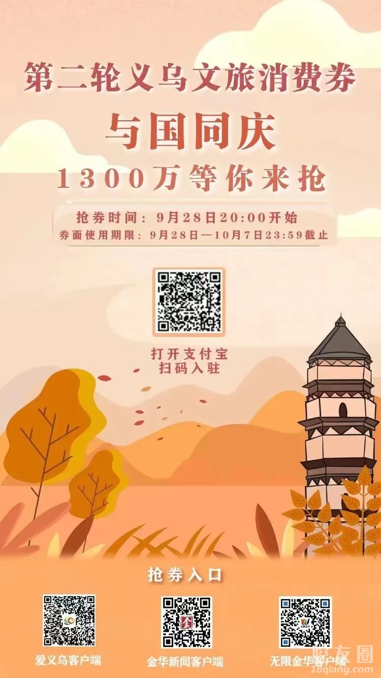国庆长假将至,义乌秋色正浓。近日,记者从义乌市文旅局获悉,今晚(9月28日)8时,义乌文旅消费券第二轮准时开抢。
