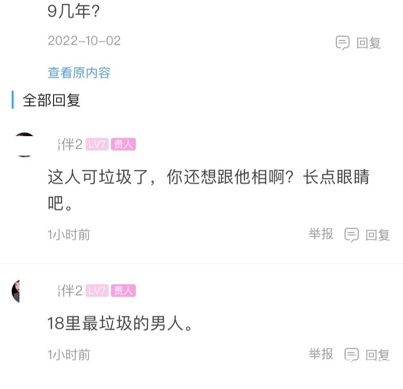 这里有个女人脑子有毛病吧,对人进行人身攻击,一天发好几条消息,还在别人发的贴子下留言人身攻击,就这么喜欢找人骂 ,平台把它的账号封了吧