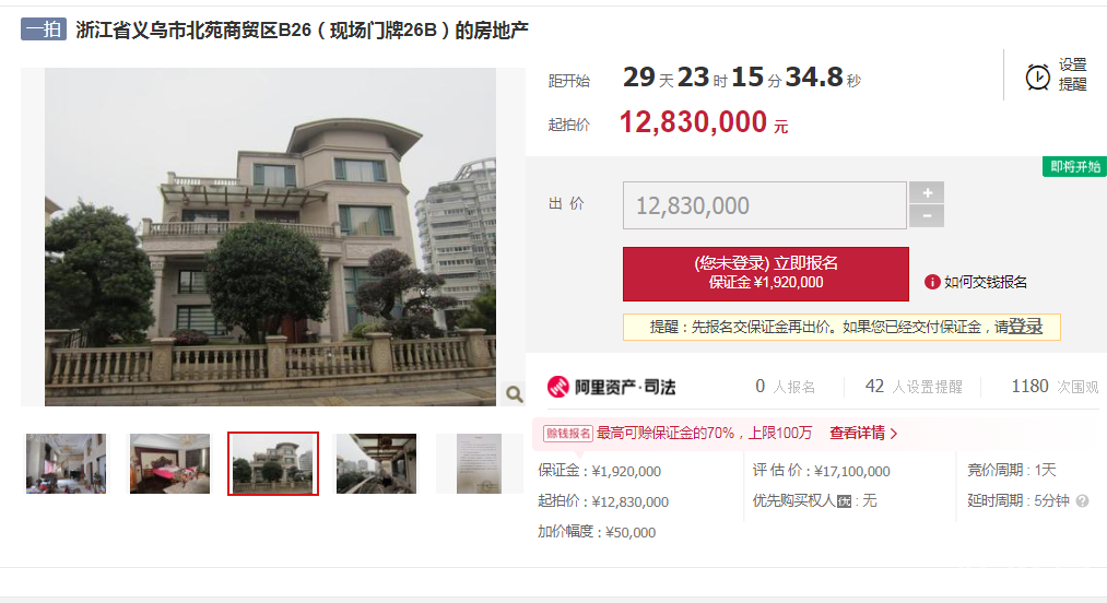 近日,阿里拍卖网上挂出了一则拍卖信息,义乌市北苑商贸区B26(现场门牌26B)的房地产,评估价1710万,起拍价1283万元,保证金192万元,增价幅度5万元(或整倍数)。