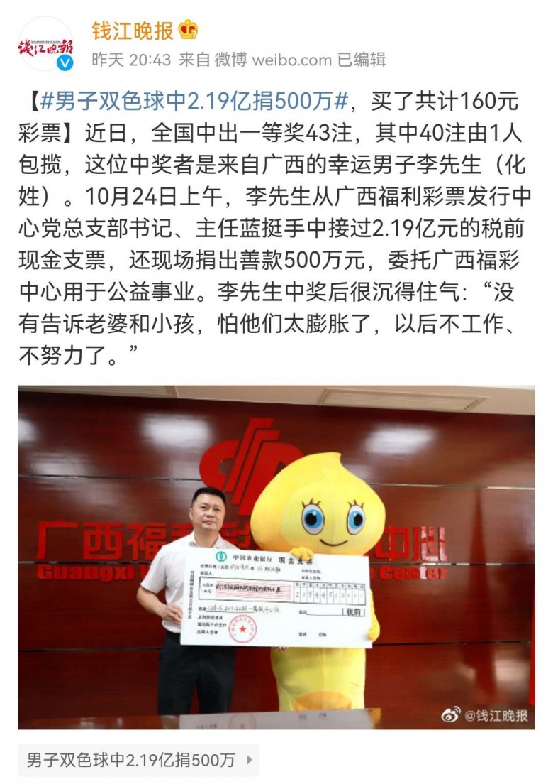 这个李先生挺厉害的,一下就捐了500万,要是我中奖估计捐不了这么多