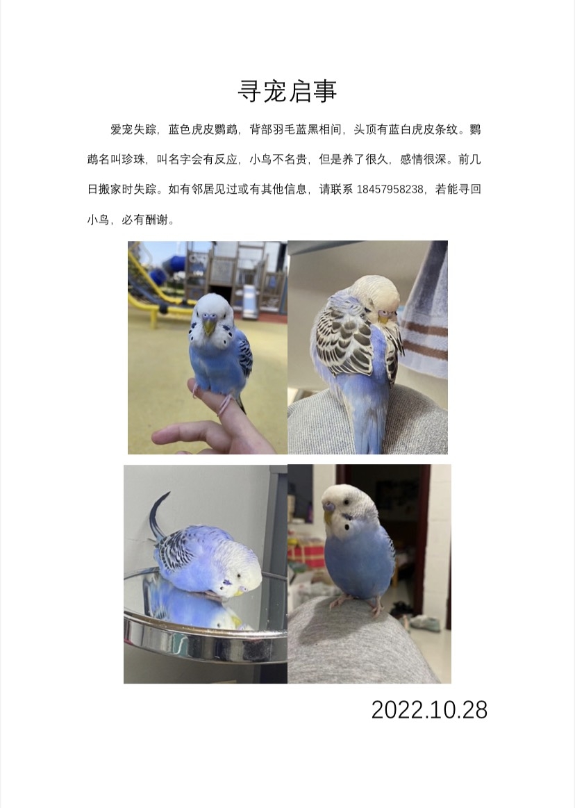 做了一个寻物启事,短期内无法回义乌,希望能找到一个帮忙找小鸟的好心人,有偿。
