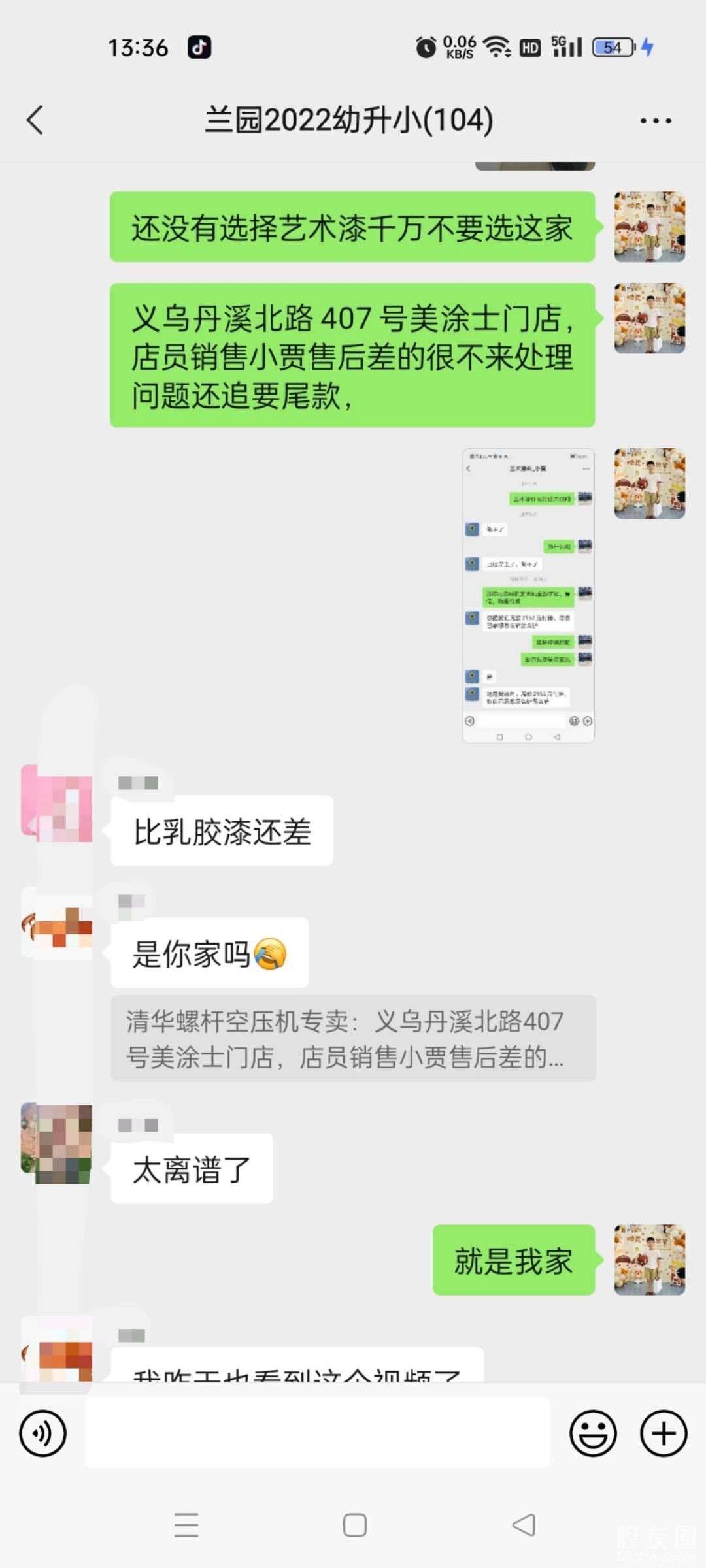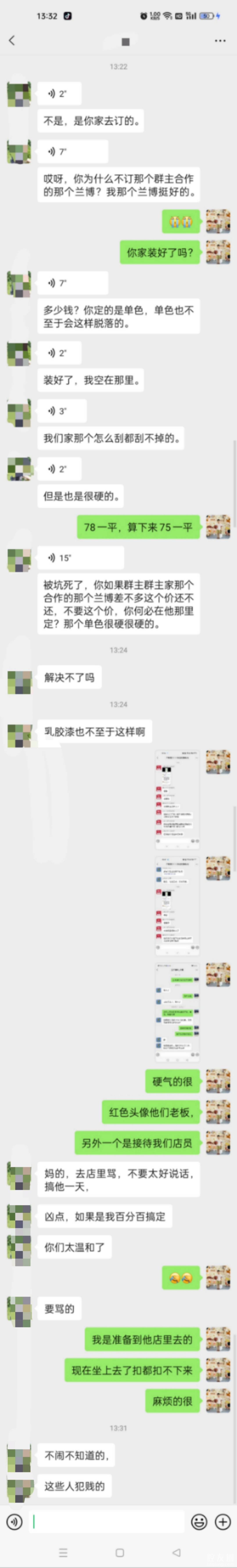 在这里说明一下第一张图片是发现这个事情之后我找店员小贾沟通问这个问题,到后面他说回答不了把我跟我老公还有他老板加到一个群里,这个第二张图是群里。老板沟通问的不清不楚的推磨一样,后面这些是我发布抖音他威胁我的话,第三张,第四张,图片是邻居找我聊天说怎么做成这样的了,第五张图片是我截图视频的