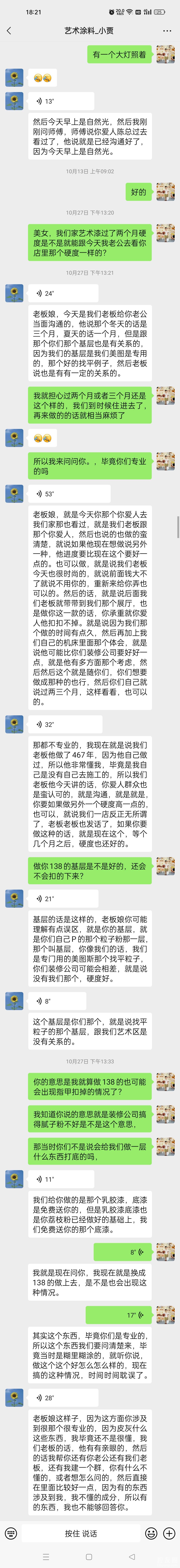 后来他就直接带我到他那里看他那面墙说这个墙体颜色还是不错比较温馨,我说可以的,他吻她多少钱,他说原价是158的现在搞活动78一平,那我就觉得可以吗,因为不懂也就大概了解到艺术漆大概得万把块钱,安装这个活动价我们便宜好多,我就跟我老公说那就这个吗,我老公说了就颜色你挑挑好就好了,然后店员小贾说就他那个墙面颜色高级灰可以的很多家老板选的这个做起来效果蛮好的,好了当时就选了这个,然后当时我们来就是要定,当然定之前,我也特意问了店员小贾,这个价格这么便宜会不会东西不好,她说不会的,东西是一样好的,就是公司搞活动给到的优惠,就价格还了一点以75一平的价格定下来了。当时付了3000块钱,在这之后我们还把我们楼下10楼邻居介绍给他了,说到这里就真的好生气了,我们那么信任她,她却在10月份12号给我们家施工做成这样子的,以下有图有视频大家可以观看,他做的时候叫我们去,叫我们现场看下颜色感觉一下,我们也没有时间去,就跟他说,就做他店里那种颜色就好了,然后照片拍给我,其实当时也看不出来啥效果,当天我老公是去看了,第二天也去看了,我老公跟我说效果还是蛮温馨的做起来,那我听了还蛮高兴的,因为一直都比较期待,第三天我也去看了,然后我就用手去摸客厅哪里,两只手都去摸,左手我戴着戒指,右手啥都没有,轻轻的摸,戴戒指的左手,戒指那个地方就有划痕,右手没啥问题,我当时还跟我老公说这个估计刚刚做还没有干,然而做完过了一个星期左右,我老公发现这个艺术漆怎么用手指甲都能扣的下来,就去问她,当然也去问别人了,了解,了解到艺术漆不是这样的,不会这样一扣就掉,那我们就找到她,中间是我老公跟他沟通,后来他们(美涂士)老板也去我们新房哪里看了,大概就是这个艺术漆就是这样的薄的,又说现在天气凉要过两个月或三个月,后来有叫我们换138的好一点的,当天也到他店里去看过了,他店里的那个跟我新房做的是同一款同系列的,店里的确实很好,怎么扣都扣不掉,我老公就准备说做138的,回来跟我说了,我当天下午就找到店员小贾,我就问她微信聊天截图大家看。