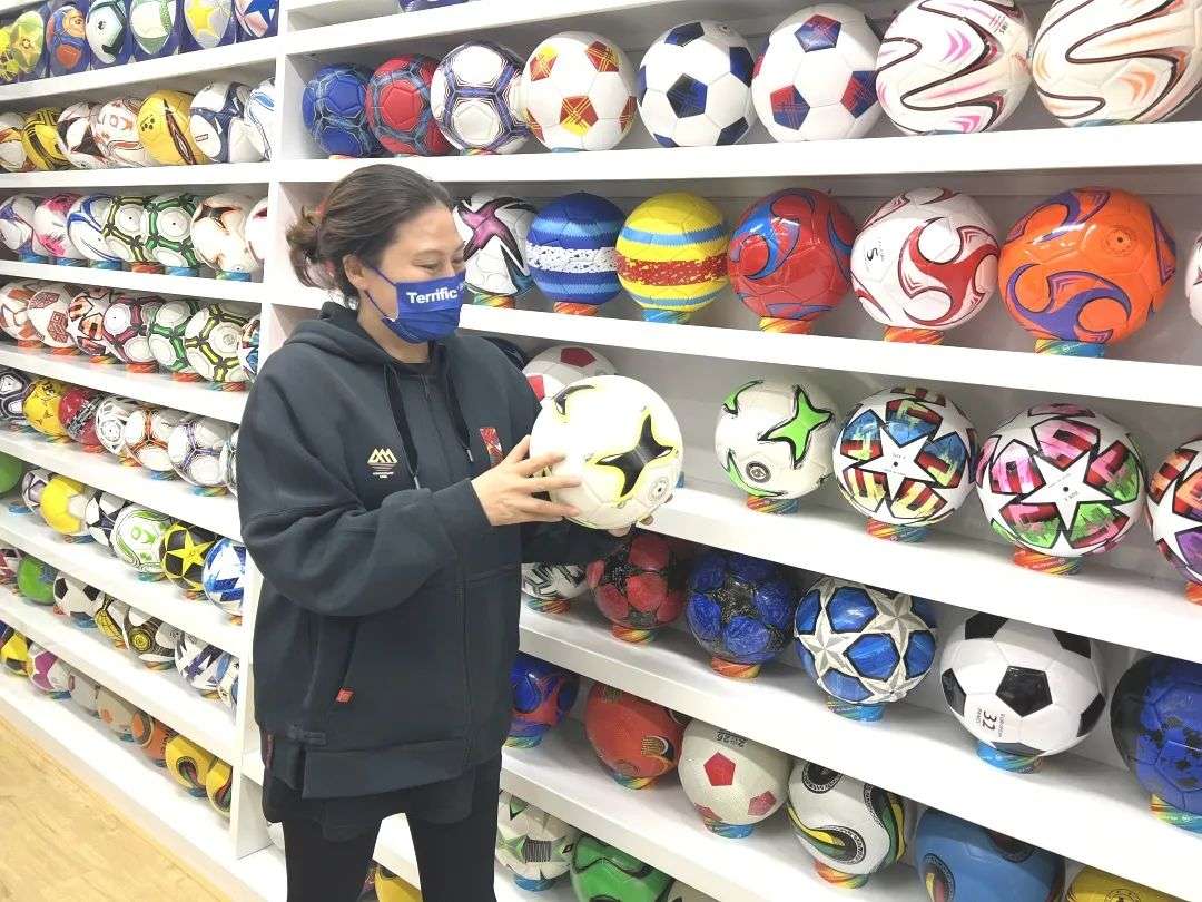 生产足球的商户吴晓明,从今年3月起,他的工厂早上7点就开工,厂里除周日晚不加班,平常都要加班到晚上9点之后。订单需求量太大,作为老板的他与妻子工作日也都在厂里帮忙。目前,他的工厂出口纪念品足球已超过100万只。