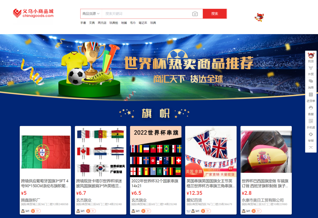 在比赛来临之际,Chinagoods也专门开辟了世界杯热卖商品板块。从热门的旗帜、足球、定制奖杯到周边服饰、加油玩具、饰品配件等类别都选取了在市场中可靠度高的商品进行推荐。