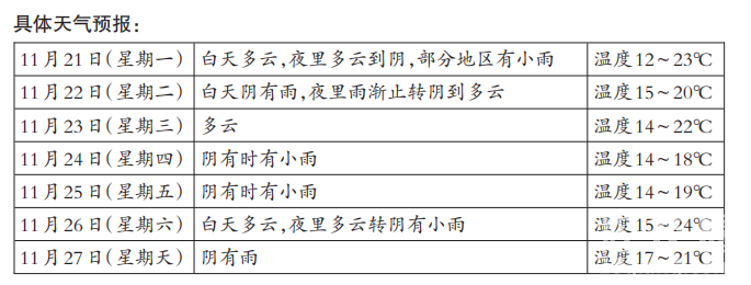具体来看义乌,本周多阴雨天气,气温小幅波动。其中11月22日、24日和27日前后各有一次过程性降水天气。从气温上来看,本周气温较去年同期偏高,尤其是最高气温,本周最高气温还在20℃上下,去年同期最高气温在17℃左右。本周最低气温也不低,除了今天只有12℃,剩余几天的最低气温都在14℃及以上。