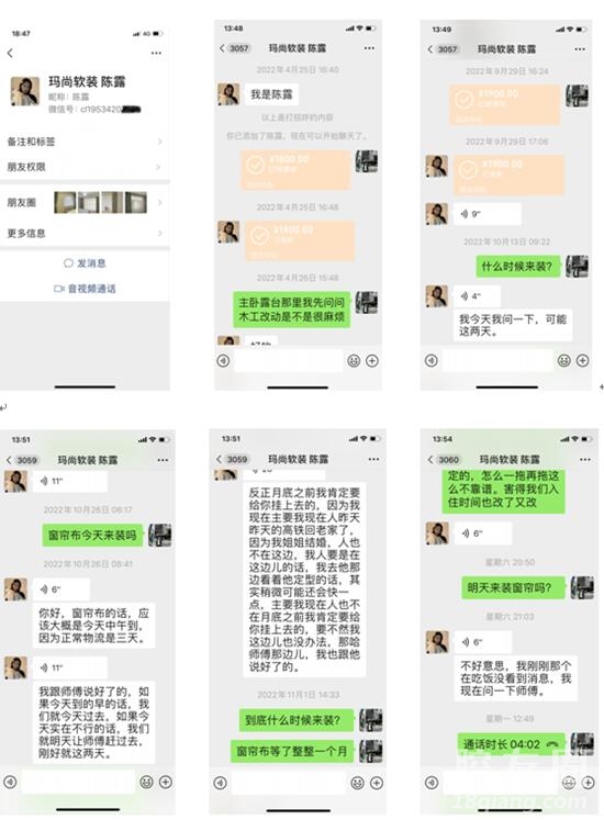 但是,一旦遇到不靠谱的材料商那就糟心了。比如这次的窗帘布商家。在超级腕家博会付了定金,上门测量付完尾款后就开始一次又一次的催问,每次问什么时候来安装, 每次都说就这一两天过来装,但是每次又临时以各种理由突然说来不了,直到现在未见人影。