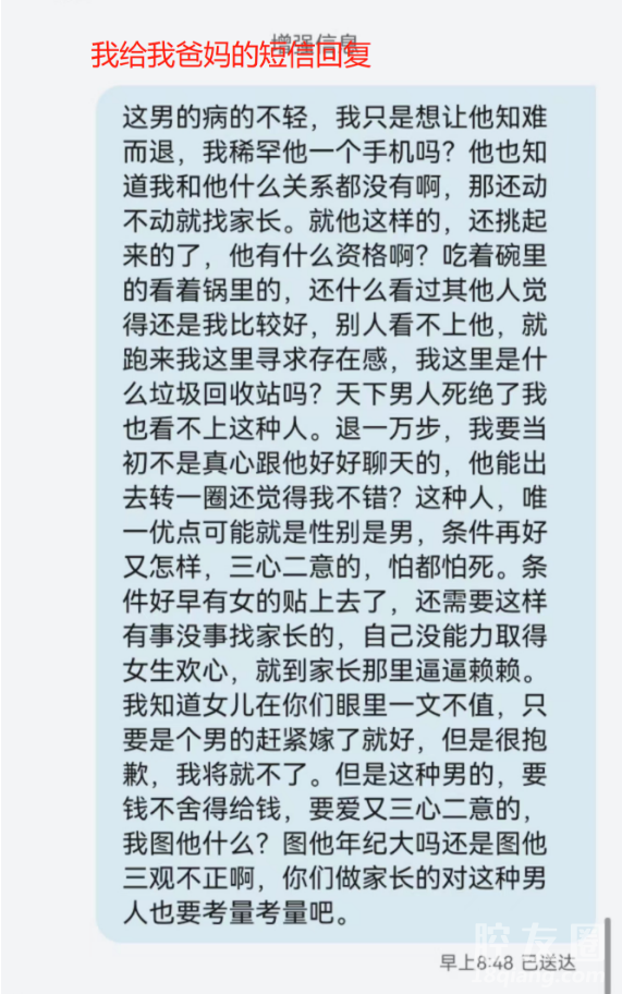 据我了解,这个男的这几个月时间里,谈了2个女的,都看不上他,然后就想着回头来找我,还想让我爸妈给我施压来拿捏我,脑干缺失了吧。还来我爸妈那里搞又婊又立这一套,可真把他牛逼坏了!