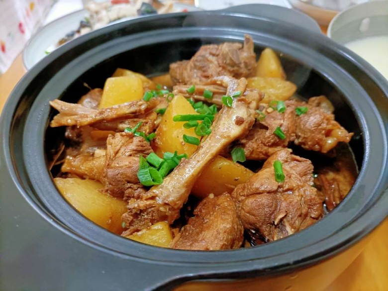 ,今天的伙食着实合了小伙的胃口,砂锅红烧鹅
