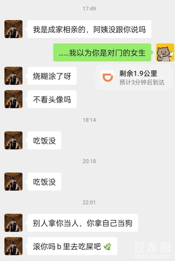 我妈推给我的人,我以为是对门的邻居女生就加了,然后昨晚我坐车手机快没电了就一直没看手机,等到快到地方了我掏出手机准备打车,就看到这些了,他骂完我就光速把我拉黑了,所以我也没有回击回去。