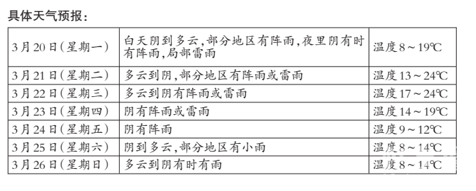 3月上旬,春光明媚;3月下旬,雨水开始占上风。据气象部门消息,本周,南方一改前期少雨格局,进入多雨期。今明两天,南方雨水不停歇,长江中下游等地将现强降雨。好在从明天起,南方将陆续回暖,多地最高气温将达20℃左右。