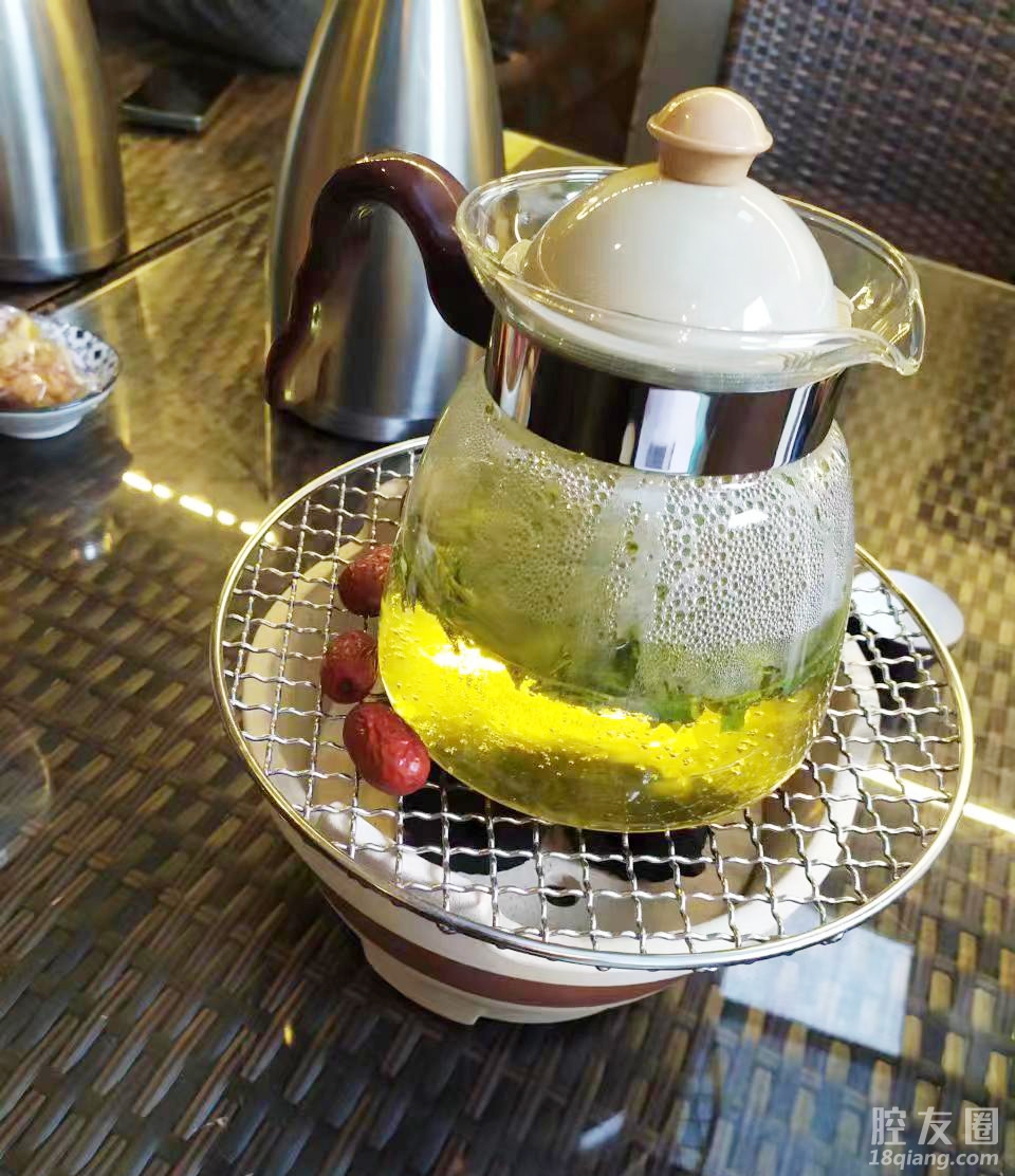 陶炉里炭火正旺,上置一口外壁熏得发黑的陶壶,里面咕嘟咕嘟正煮着茶呢,颇有一种返璞归真的感觉,尤其是红枣被火烤的香味很是鲜甜。红泥小火炉,能饮一杯无?