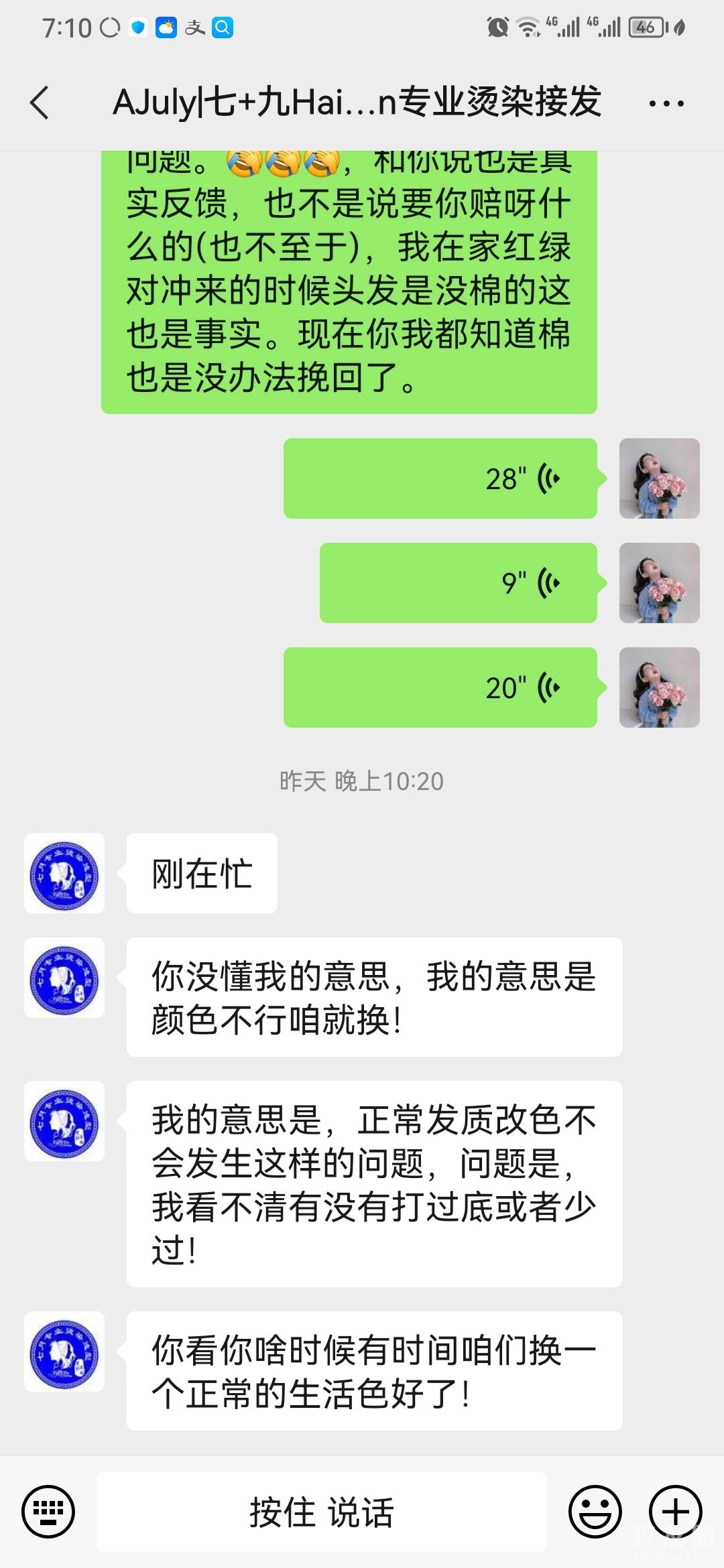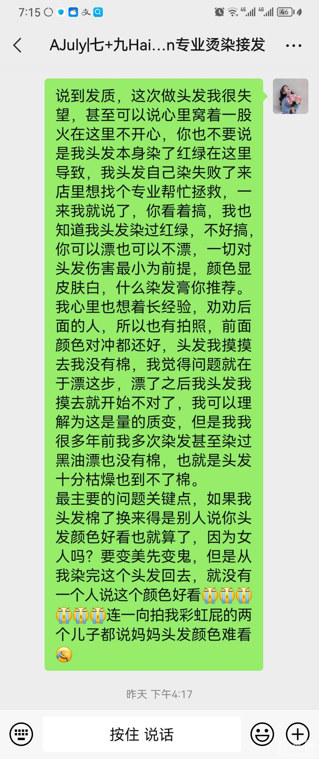 且不说头发棉了,就说这个米灰直接显老10岁。当时钱都不想给了,一万个内心草尼玛奔腾。想消协,电视台,报警。但想着钱也不是很多就算了,但是这个头发真的很影响心情,自己做头发做了这么多年了,从初二就开始做头发,如今也是一年两次的频率在做头发,但是这家店直接断送了我未来三年在别家美发店消费的机会!头发已经棉到耳朵处了!!和他沟通,他全程还在怪我不知道,还说我头发之前就有问题,但是拜托,我头发来的时候只是花了颜色,没有棉吧!你接了我的单你可以颜色做不好看,因为每个人审美不同。但是你不能伤我的头发到这种程度吧!3月19号发生的事情真的让我难过了好几天!按我朋友的话说,以后真的不要去这种店做头发了,内心一万个后悔。特发这个贴给后面的义乌姐妹避雷。第一不要自己染发第二不要去这里的店。(雷店已经在美团找出地址发图了)