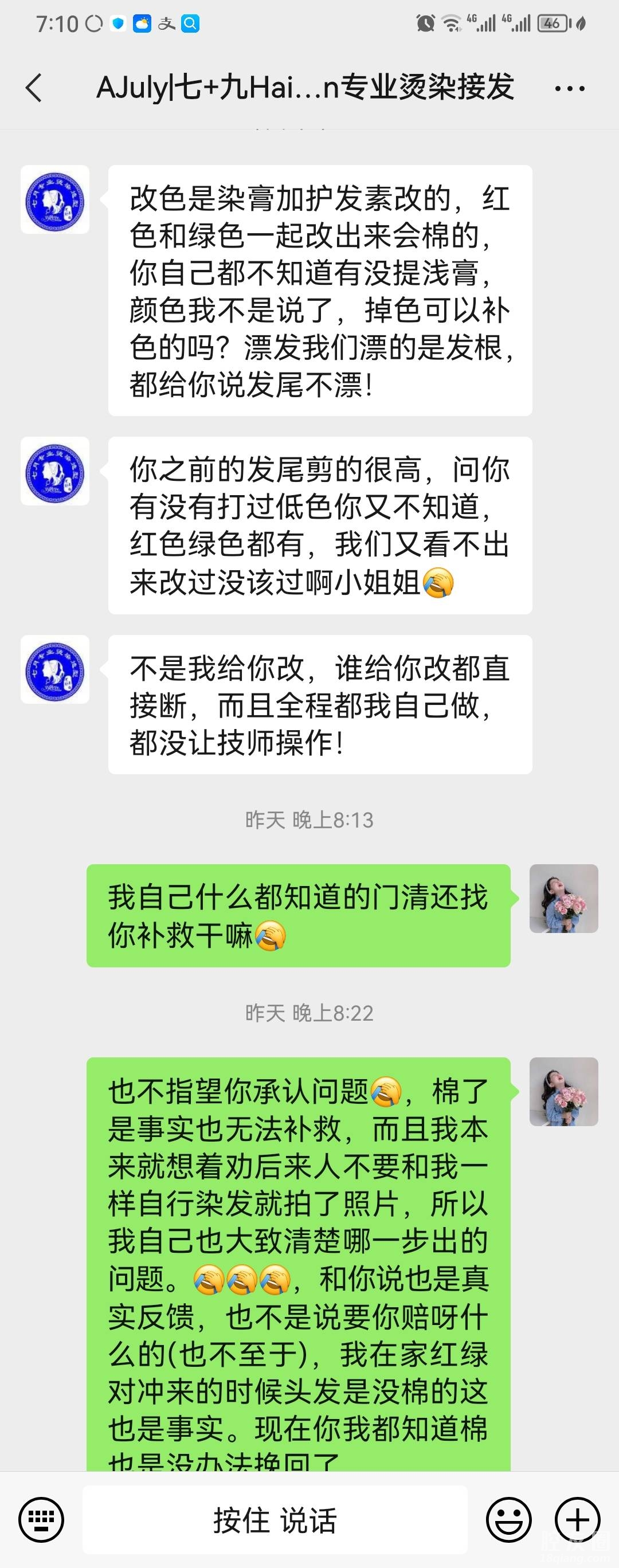 因为想着后续在小红书发经验贴劝姐妹们不要家中自己染色,故每一步都有拍照,也就很清楚自己的头发哪一步毁的。每一步老板操作是什么我也有问,刚开始他说是颜色对冲,那个时候头发是好的,后面到漂发的时候,店里有其他客人来了,也不知道为什么,店里人其他人不去接待客人,他在我漂发的时候还顺带给客人剪发。漂发冲洗后我的头发就开始不对了,棉絮一般了!!!做之前他和我说做一个薄荷米棕色,结果最后他说给我无意染出了另外一个颜色米灰色,我觉得很可笑,事后我外省的一个美发朋友说一个做美发的人连自己说的颜色都做不出,还说意外收获一个颜色,那是真的菜!