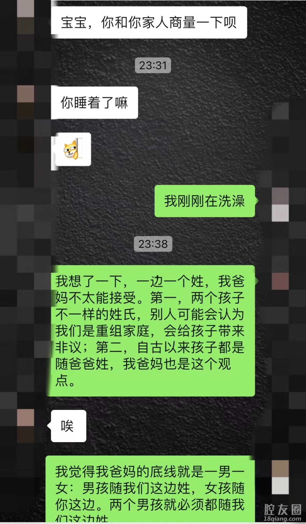 本来一切都商量妥当,但现在女朋友要求婚后有个孩子可以随她姓,她愿意生两个,可以大的随我,小的随她。