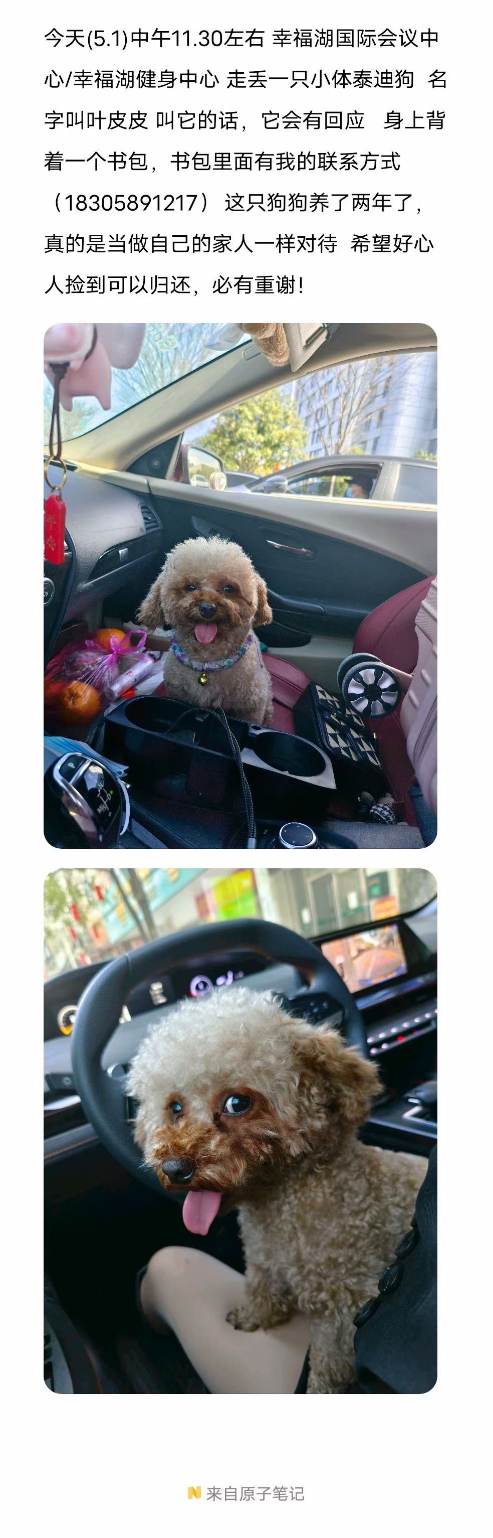 今天(5.1)中午11.30左右 幸福湖国际会议中心/幸福湖健身中心 走丢一只小体泰迪狗 名