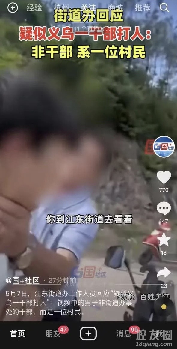 近日,一段疑似义乌一名街道干部动手打人的视频在网上传播。视频中,一名疑似中年男子言语嚣张,甚至还动手掐了拍摄视频男子的脖子。