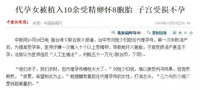 曾经,台湾的一名刘姓代孕妇女,就一次性被植入了10个以上的受精卵