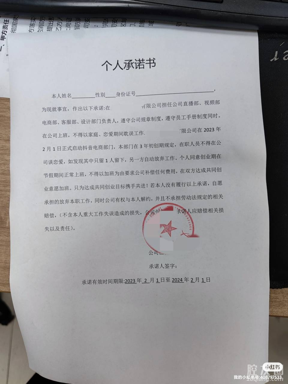 无视法律,让我们签这个个人承诺书,上面写着节假日要正常上班,加班没加班费,公司内部不能谈恋爱,如果没履行自动辞职
