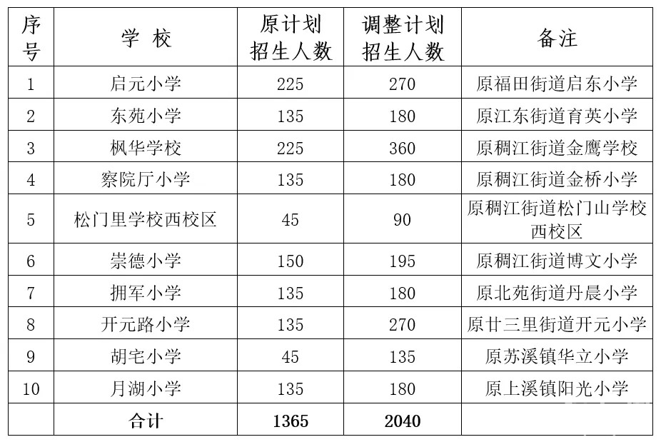 为有效盘活教育资源,缓解就学压力,进一步满足适龄儿童就学需求,经研究,决定根据相关学校办学条件和新生报名情况,调整部分小学招生计划。具体如下: