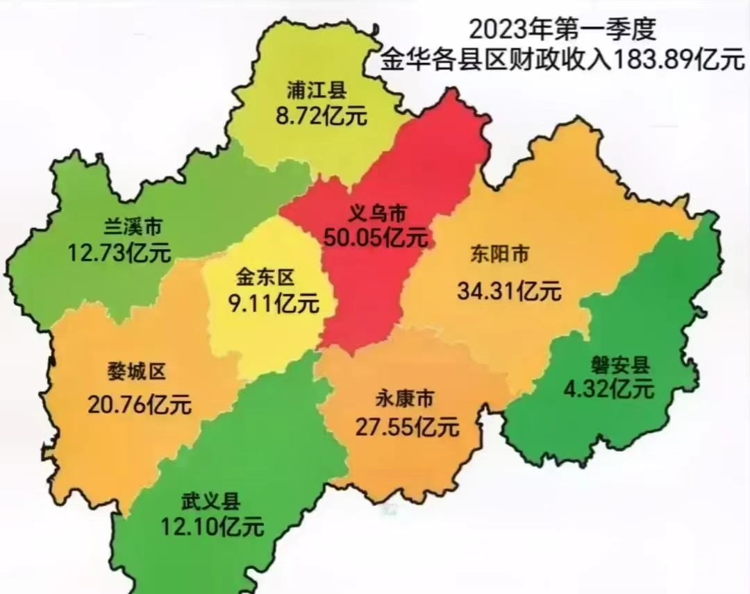 2023年第一季度金华各县财政收入183.89亿,义乌厉害了,第一