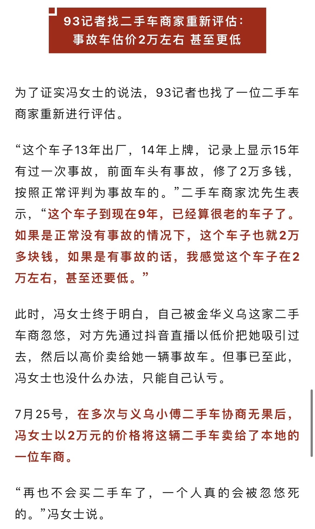 于是双方签订了购车合同,商家承诺车辆无重大事故、无火烧、无水泡。不放心的冯女士又多问了一句,“我还问他,回去路上不会抛锚吧,万一抛锚了、不动了怎么办?他说你放心,绝对不可能的。”