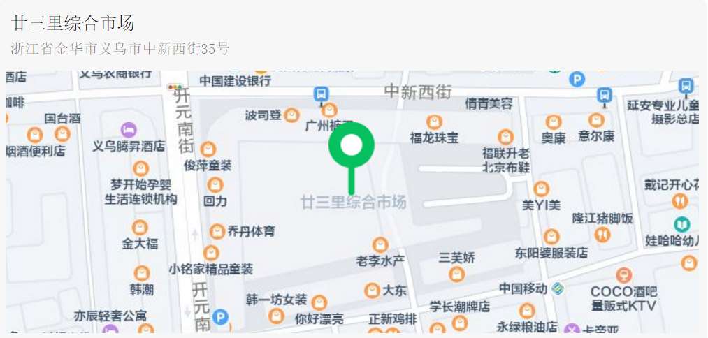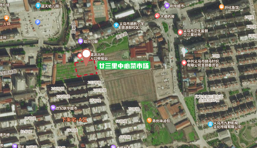 廿三里中心菜市场由义乌市市场开发服务中心有限责任公司投资运营,位于廿三里街道通宝路1688号(通宝路与康平路交叉口西南侧),交通便利,消费群体辐射廿三里、周边乡镇和邻近县市。