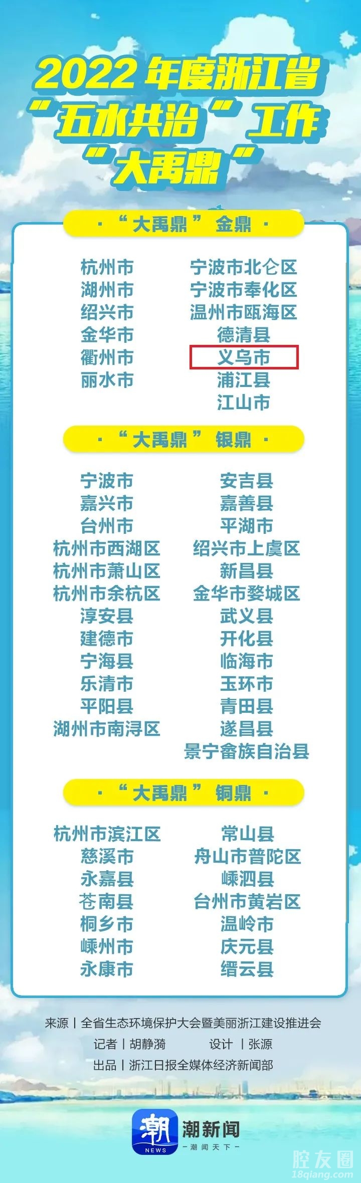 据悉,大禹鼎“金鼎”是全省“五水共治”最高殊荣。近年来,义乌全力打好“五水共治”攻坚战,深入推进“碧水提质”行动,全市水生态环境得到持续巩固提升,水安全保障能力得到大幅提升。目前8个县控及以上断面、8个集中式饮用水水源地水质达标率均为100%。建成“九厂一网”污水处理体系,日处理规模已达75万吨。在全省率先建成全域“污水零直排区”,产业园低小散企业水污染整治入选全国工业园区水污染防治优秀案例及省级标杆工业园区 “污水零直排区”培育名单。“义乌市全域治水 发展美丽经济惠民生”案例被评为第二批全省生态环境系统共同富裕最佳实践案例。