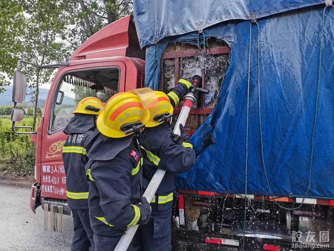 消防救援人员立即分组行动,一组协助交警做好现场警戒,另一组出水枪对着火部位进行灭火及降温冷却,第三组对整车货物进行搬移,防止内部阴燃。