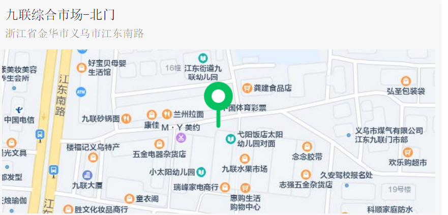 九联综合市场承建于1998年,现由义乌市市场开发服务中心有限责任公司委托管理。市场占地面积约4000平米,位处于江东南路与黎明湖路交叉口,地理优越,人群密集。