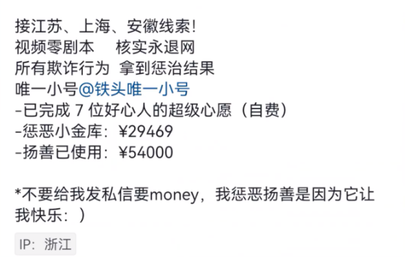 在铁头每条视频的评论区里,都在求粉丝打赏,其简介显示,“惩恶小金库还剩余29469元,扬善已使用54000元”。不过,其直播间里再三强调,自己现在不考虑赚钱,对欺诈消费者行为本身就深恶痛绝。