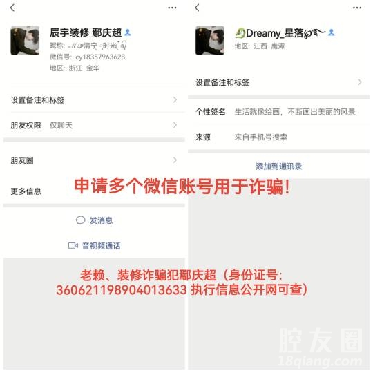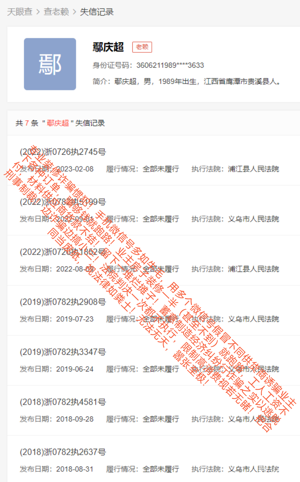 此装修诈骗惯犯诈骗多年(17-至今),逍遥法外!欠钱不还,死皮赖脸!诈骗生涯,战绩彪炳!一次失信限制高消费,失信千次还是只限制高消费,反正不用判刑索性终身干诈骗!把合同当废纸,视法律如粪土!同时诈骗几十家!上诈甲方客户,下骗工人供应商!诈骗一次,年入百万!一人诈骗,全家享福!合伙诈骗,共同致富!限制高消费,又能耐他何?没有刑法兜底老赖只会无法无天变本加厉,永远不会主动还钱!被骗者损失永远无法得到弥补!不立案不判刑!手机微信号一换,另找小区接着骗!周而复始,循环诈骗!为了其他人不被鄢庆超诈骗,请看到者拍照、录视频帮忙转发!由此诈骗犯消息请留言相告!!此诈骗犯多年来一直藏匿于义乌及周边等地,靠自己或者与他人合伙开皮包装修公司诈骗为生计!多年来一直有诈骗前科,多次被法院列为失信被执行人!且均为有履行能力而拒不履行生效法律文书确定义务的老赖!其套路就是前期靠欺骗忽悠等诈骗手段取得业主信任、同情与其签订合同,再找各种理由要求业主交各种预付款、进度款以及各类定金,推销所谓合作伙伴的电器、柜体(用多个微信号伪装成电器、柜体等老板诱导业主下订单)。在拿到钱后开始找各种理由拖延装修,且在装修过程中会拉拢潜在客户到他正在装修中的户主家里参观,通过吹嘘自己装修精美价格实惠,再贬低其他装修公司来拉拢潜在客户与其签订装修合同。后期骗到足够多的钱以后直接携款跑路,手机故意停机至空号,微信直接弃用!如此一来不但业主损失惨重,各种供应商和工人的损失也不计其数。而在被鄢庆超诈骗的业主中,有时间抽空去催促施工的业主损失相对较轻,但在外地工作无暇监督装修过程的业主则损失尤为惨重!本人小区受骗业主、供应商和工人被骗几十起,当所有人到浦江黄宅派出所报案后本以为警方会以刑事诈骗罪将鄢庆超抓捕归案、判刑!令人失望的是警方以该案件为经济纠纷为由拒绝抓捕,叫我们去法院起诉!(警方有将鄢庆超和其小三被抓紧派出所24小时后又把人放走),老赖鄢庆超通过钻法律漏洞通过蓄意制造经济纠纷行刑事诈骗之实,以逃避法律刑事制裁!一但受骗,业主、供应商和工人的损失也难以追回!且诉讼至法院后司法鉴定费用四五万起步,维权成本极高!此等社会人渣若是不加以刑事制裁!放纵不管任其逍遥法外必定会有更多善良无辜的人上当受骗!装修诈骗在各大网络平台随便一搜一大堆,必须立刻引起社会各界人士和相关部门重视!否则只会让善良之人被骗,诈骗之人发财!请各位看到此贴后将鄢庆超个人信息转发到各自小区,以免更多无辜之人上当受骗!