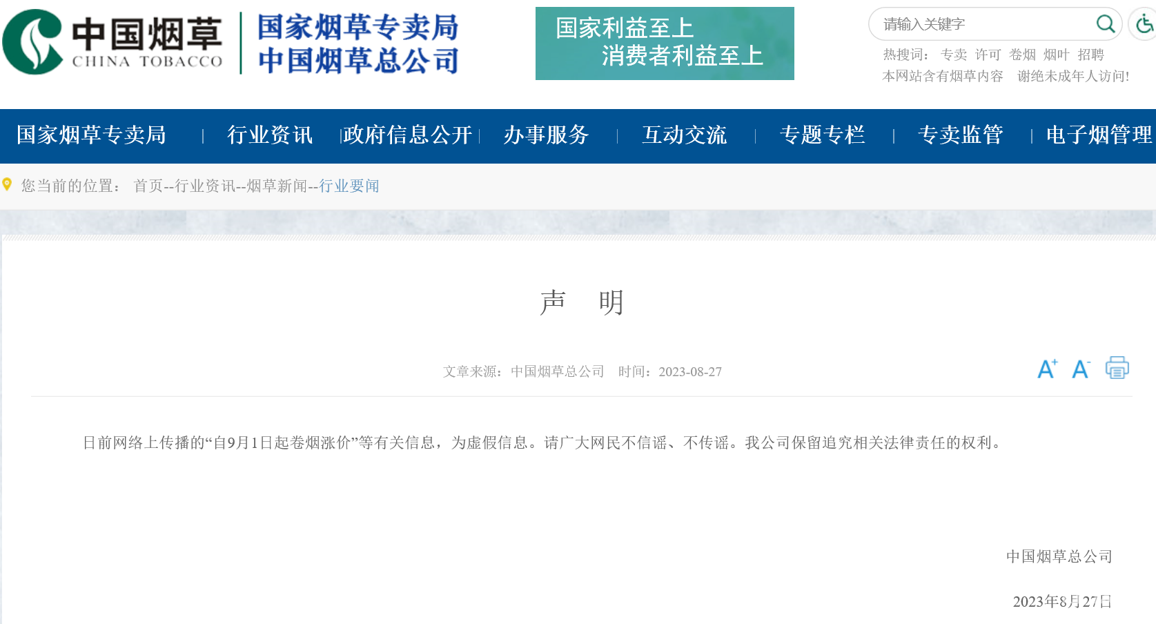 8月27日,中国烟草总公司就网传“自9月1日起卷烟涨价”等有关信息发布声明,全文如下:
